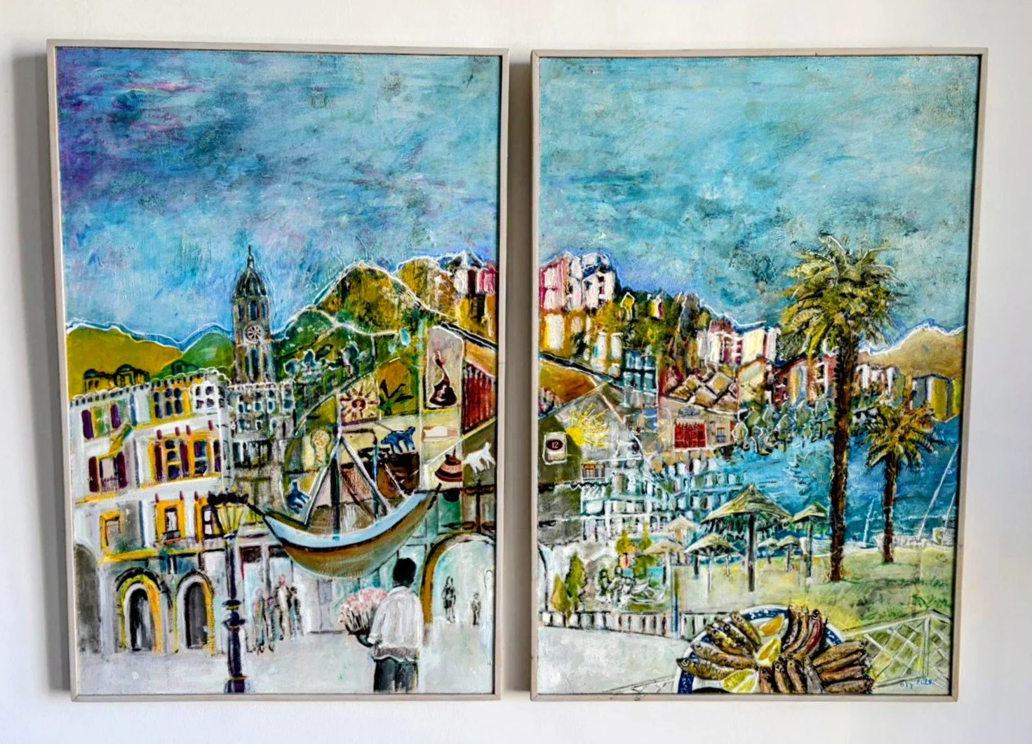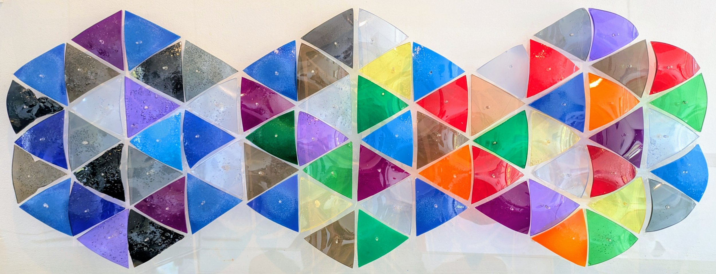 Compositie met spiegelend plexiglas in gelijkzijdige driehoeken.